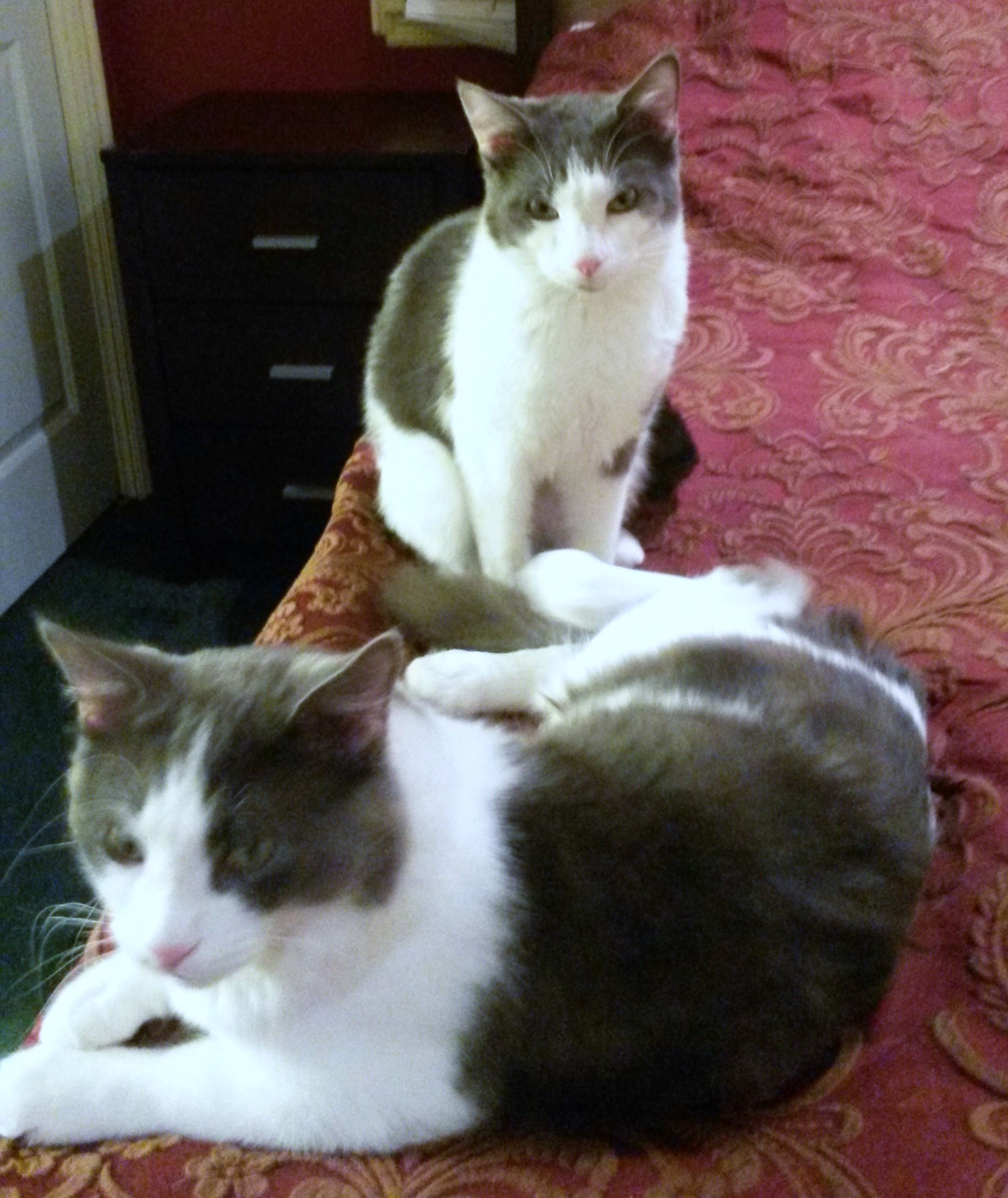 Whiskers and Scuddles: These two handsome 9 month old cats are very friendly. Whiskers is the leader of the two and is the first to demand your attention. Scuddles follows at his leisure. Whiskers has the longer hair and a fluffy tail while Scuddles has a sleek, shiny coat. It would be nice if they could go to a home together but it is not required.