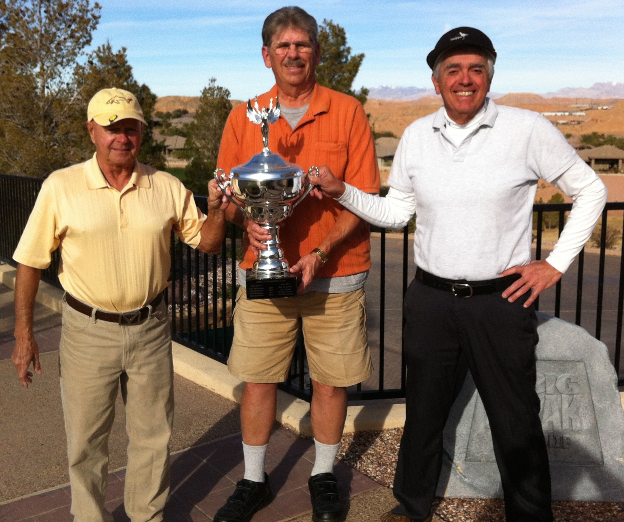 From left to right, Low Gross winner, Tim Miller is presented the Cup by MMGA President Bubba Petrick with Low Net winner Bill Irace on the right. Submitted photo.