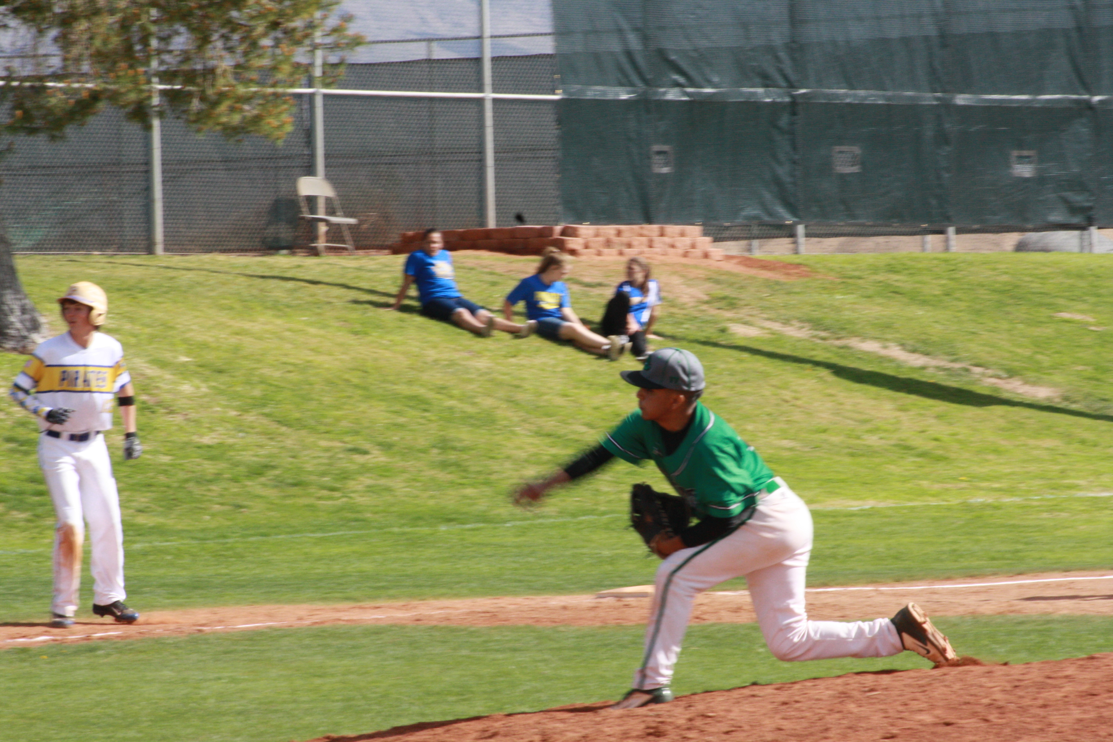 Bulldog reliever Marcelo Lara follows through on a pitch during the Bulldogs 6-3 loss to Moapa Valley in the Cactus Classic championship game Saturday afternoon, March 12. Photo by Lou Martin.