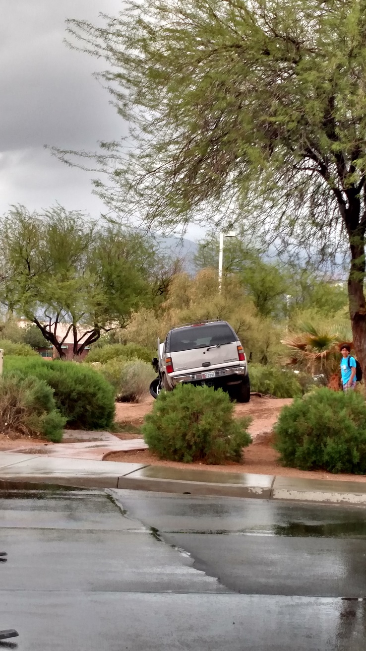 Two crises were avoided in the timing of this accident. The first was that the collision sent the GMC Suburban veering to the south side of Hafen Lane and onto Hughes Middle School property in such a way that it missed a power transformer box by mere inches. Speculation concluded that had the vehicle hit the box, there would have been a localized power outage and further injuries.